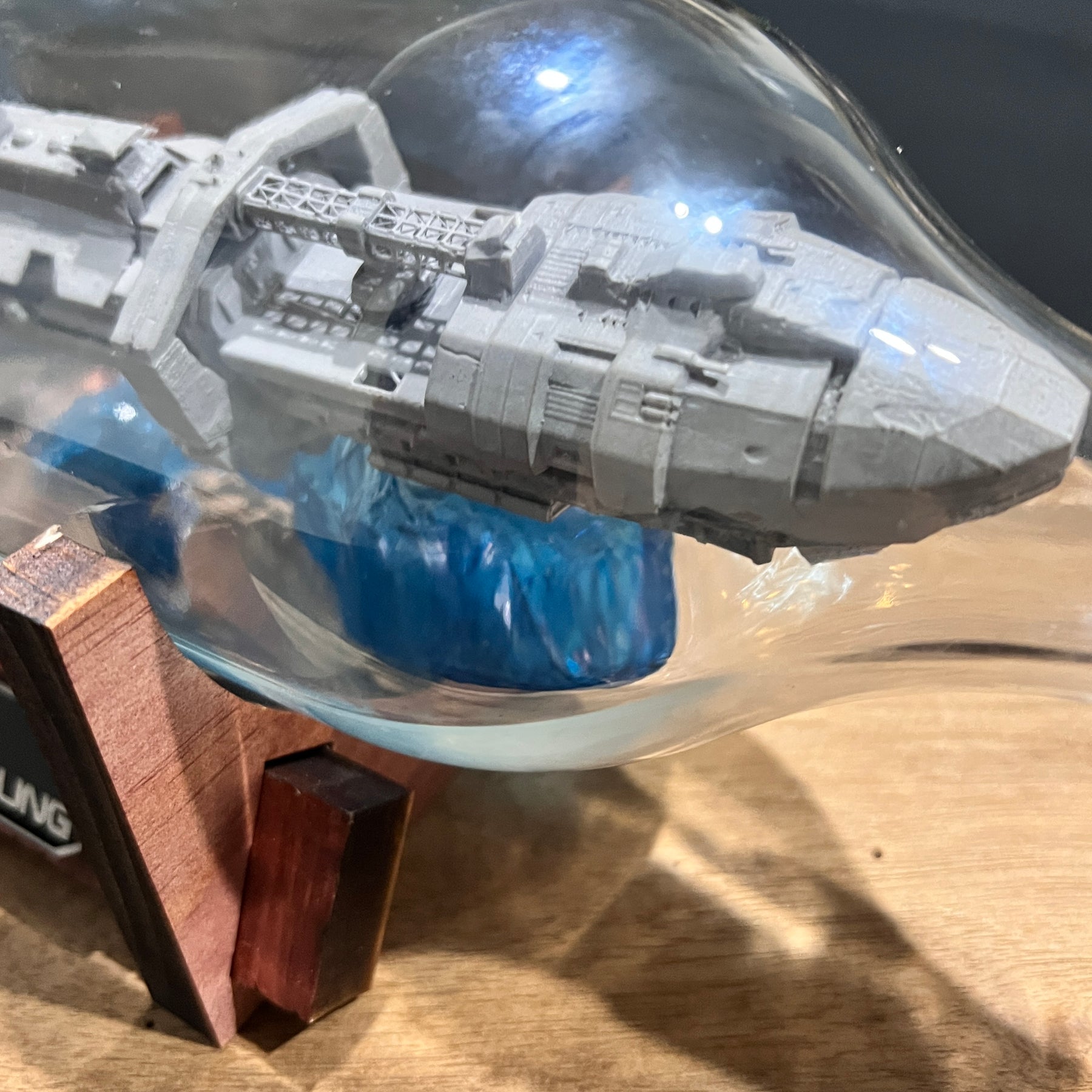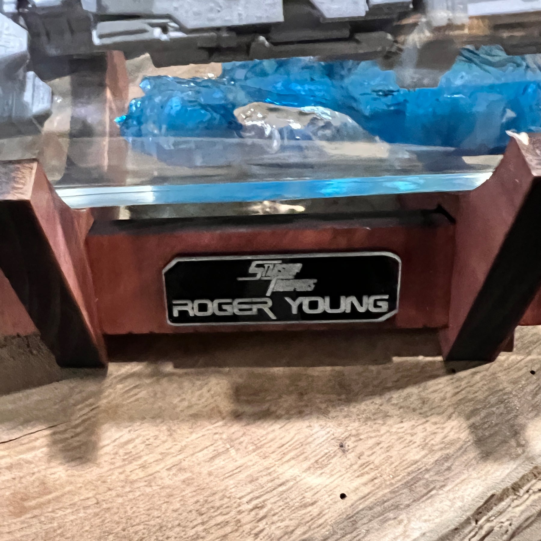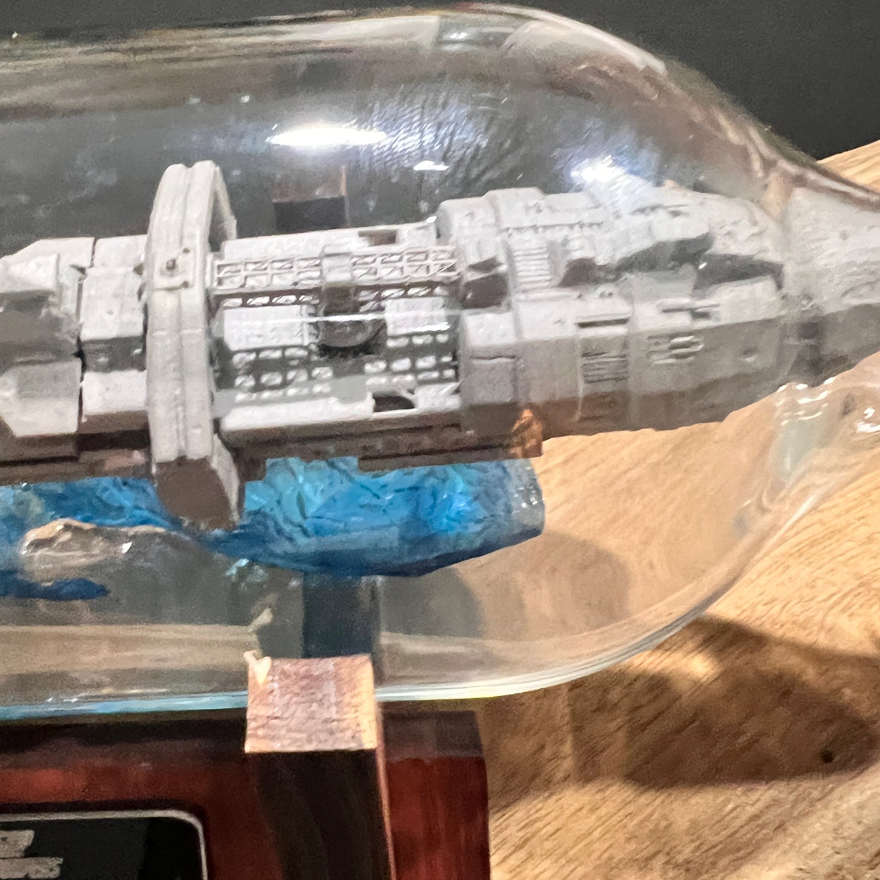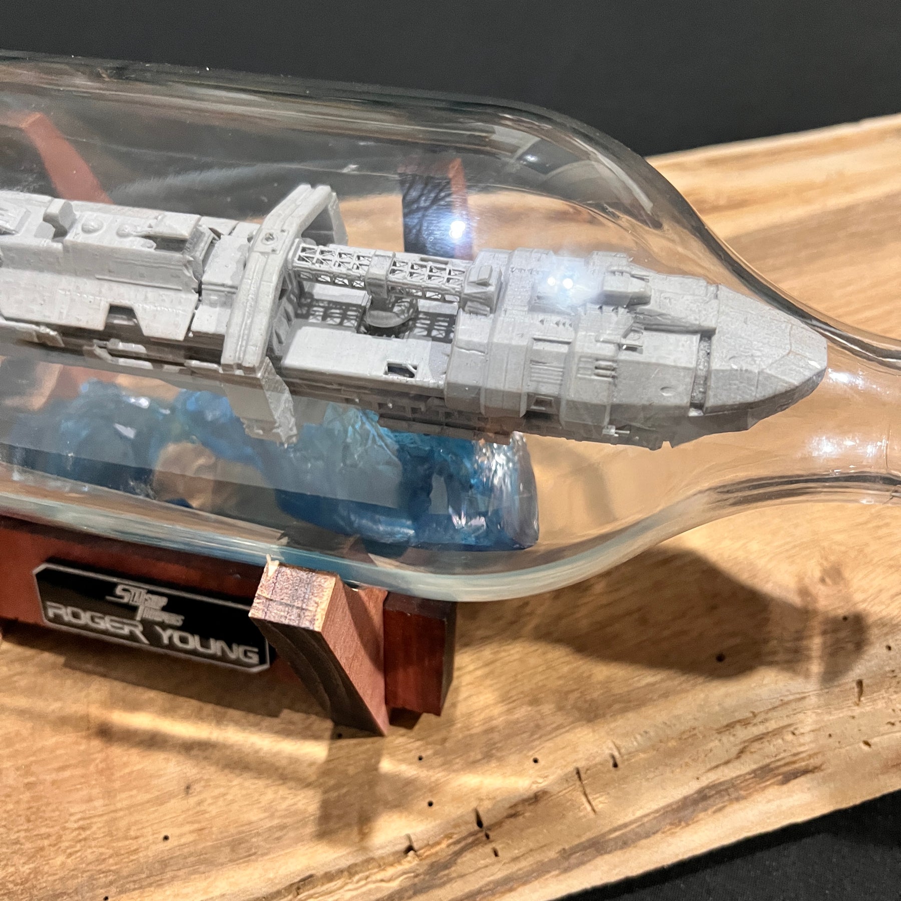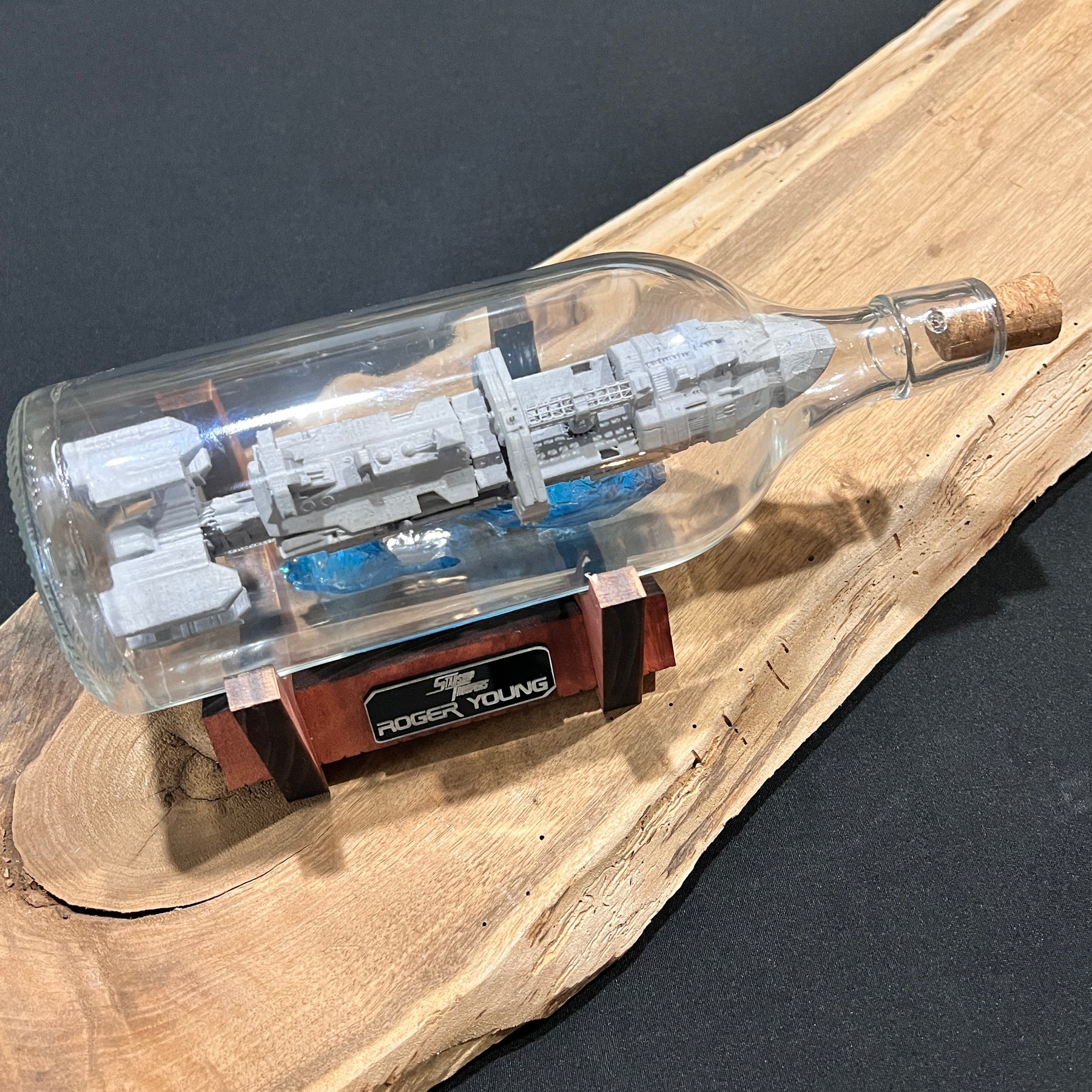 The Roger Young from Starship Troopers. Custom printed and painted Roger Young starship mounted in a bottle. Includes wood stand and laser engraved plaque.